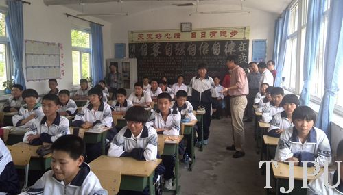 近日,我校驻天平庄村帮扶工作组在帮扶工作中不断拓展帮扶工作内容,在学校党委组织部、校团委、外国语学院、经济学院的支持下,积极发挥大学生志愿者的作用,与蓟县白涧镇初级中学合作,开展了一次别开生面的感恩教育和英语学习互动活动。
