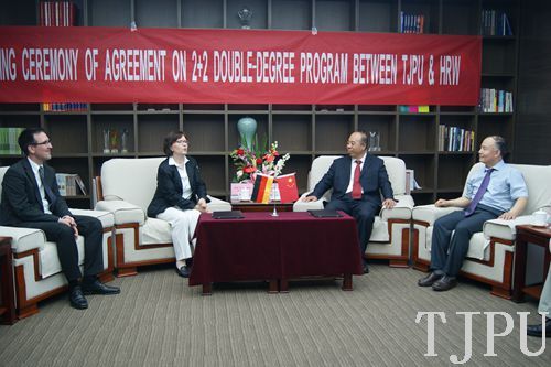 下午4:30,校长杨庆新在行政中心412会议室接待了克劳茨教授一行。杨庆新校长首先对克劳茨校长一行表示热烈欢迎。双方简要介绍了各自院校的基本情况,并就两校合作交流的相关事宜展开会谈。会谈结束后,杨校长和克劳茨校长代表两校签订了《天津工业大学与德国莱茵瓦尔应用技术大学本科2+2双学位(机械工程)项目合作协议》。