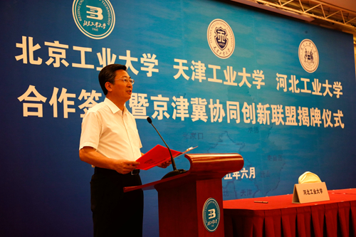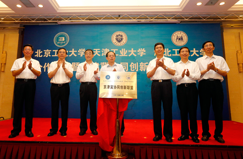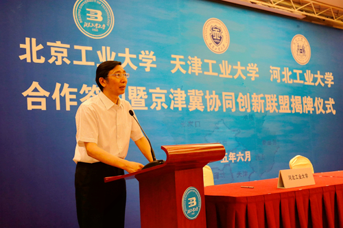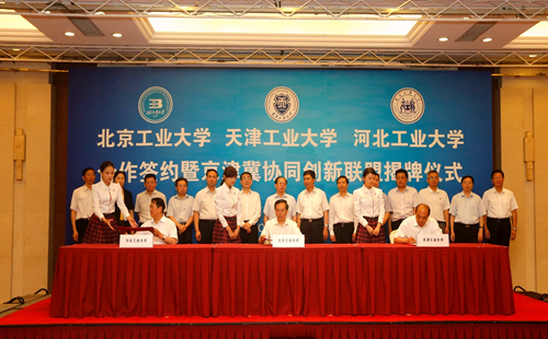 为深入贯彻京津冀协同发展的国家发展战略,提升京津冀高等教育服务区域协同创新能力,由北京工业大学、天津工业大学、河北工业大学合作成立的“京津冀协同创新联盟”,6月14日上午在北京签约。北京市委常委、教工委书记苟仲文,天津市人大常委会副主任苟利军,河北省副省长许宁出席并对三所高校强强联合给予充分肯定。天津市教委副主任韩金玉,天津市科委副主任贾堤,天津市环保局副局长谢华生,我校党委书记张宏伟、校长杨庆新、副校长程博闻,以及相关学院和职能部门负责人出席仪式。