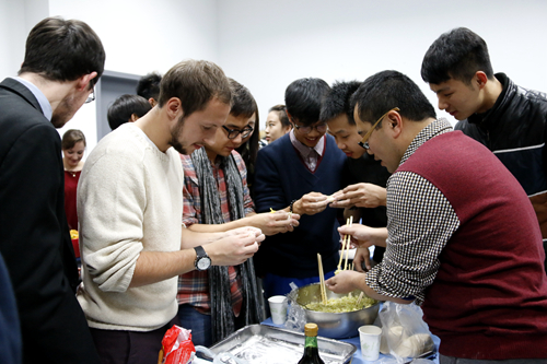 中外饮食文化在这次活动中彰显异彩。德国、芬兰学生制作的小点心、饼干,柬埔寨的甜点、韩国学生的紫菜包饭、拉面和中国学生的饺子、麻花、皮糖、年糕、崩豆等特色食物各领风骚,纷纷登场。同学们在制作这些美食的过程中体会了人类文明的多彩性,品尝了各种味道的美食,校园里始终飘荡着诱人的芳香。