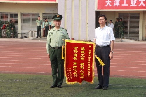 最后,校党委书记张宏伟向承训部队武警滨海新区支队副参谋长任民中校赠送锦旗,汇报大会圆满结束。