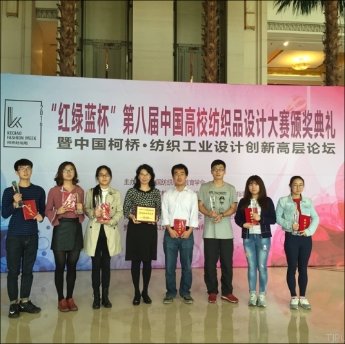 本次大赛收到来自全国26所纺织院校的参赛作品共911份,其中我校纺织学院共提交作品120余份。经过激烈角逐,我校学生获得一等奖6项,二等奖9项,三等奖15项;另外,我校获得“最佳组织单位奖”,荆妙蕾、匡丽赟、刘丽妍、宋广礼、王威、王庆涛6名指导教师获得“优秀指导教师奖”。与往年相比,本次大赛我校在获奖等级和数量上都有较大突破。