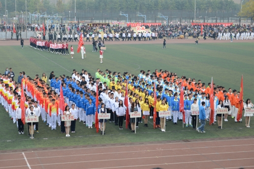 伴随着《运动员进行曲》的激昂旋律,在国旗护卫方阵的带领下,运动员方阵昂首步入会场。17个方队以积极饱满的精神状态,高呼着整齐响亮的口号,迈着铿锵有力的步伐,走过主席台,飒爽英姿,器宇轩昂。在庄严的升旗仪式后,王晨亮副校长致辞。他重点介绍了我校这两年来体育工作中取得的新进展,包括不断推进体育教育改革,积极引导和促进广大学生养成良好的体育锻炼习惯,并且希望运动员们能够发挥奥林匹克精神,团结友爱,赛出成绩,赛出水平。随后,运动员代表和裁判员代表先后宣誓。