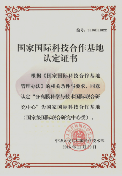 2016年12月16日,2016年度国家国际科技合作基地工作会议在浙江杭州市召开,会上公布了科技部2016年度新认定38家国际联合研究中心名单,我校“分离膜科学与技术国际联合研究中心”榜上有名,这是我校首次入围“国家级国际联合研究中心”,也是我校在分离膜领域取得的又一国家级平台。