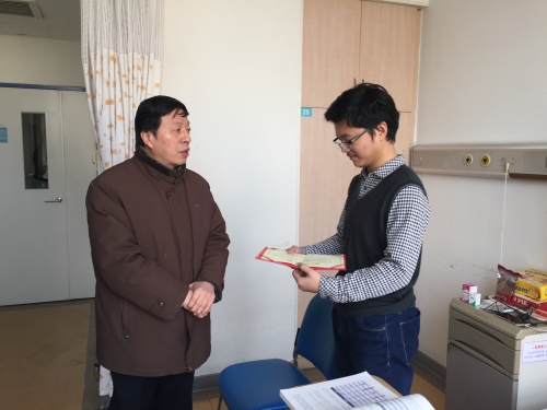 1月18日上午,王晨亮副校长到天津第一中心医院探望周润辉同学,带去了学校师生的问候和关心,高度赞扬了他无私奉献的精神,祝愿他早日恢复健康,并为他颁发了天津工业大学“无私奉献优秀大学生”荣誉证书。校团委和材料科学与工程学院相关负责人陪同看望。