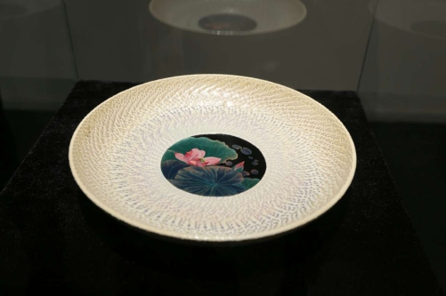大漆、陶瓷、水墨是中国工艺美术中最为重要的艺术样式。郑勇老师作品《谦明--跳刀纹陶瓷莳绘大盘1-4》利用传统陶瓷为媒介,与漆工艺中莳绘工艺结合,让陶瓷艺术和漆艺巧妙融合,再配以中国画的绘画方式,使得这三种艺术形式融汇贯通。其巧妙的设计及合理的构图,让观众无不惊叹手造之精美。入选此项目也表现了我校艺术与服装学院工艺美术系漆工艺水平在业界的影响力。