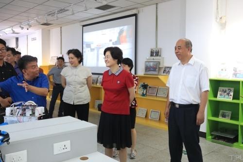 在大学生创新创业实践基地,程丽华书记一行实地考察了学校智慧教室、创新创业实验室,观看了近年来我校大学生学科竞赛、创新性研究成果,学生研发的可以对话的机器人、教学型绳带编织机、慧鱼机械创新设计、基于PLC的PIZZA自动化配料系统设计、动画专业毕业影展作品等吸引了程丽华书记一行的驻足。她详细了解了学生的创新创业情况,对我校作为天津市唯一地方院校入选全国深化创新创业教育改革示范高校表示充分肯定。在调研中,程丽华书记一行查看了工程教学实习训练中心直属党支部的党员活动室,查阅了党建材料,了解基层党建情况。
