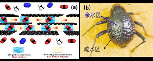 研究团队在前期研究工作的基础上(Energy Environ. Sci., 2016, 9, 3107-3112,IF=29.51),采用了新的仿生设计思路,实现了高效传递通道的构建。小分子在膜内的快速传递需要吸附与扩散的平衡,沙漠甲虫(Stenocara beetle)背部特有的亲疏相间微区结构,可实现在干旱沙漠地区快速捕集与传递水分,为吸附扩散结构的设计提供了灵感。研究团队模仿沙漠甲虫背部结构,在氧化石墨烯的片层空间内,设计了具有亲疏相间微区的高效CO2传递通道。研究工作通过在氧化石墨烯特定位点插层小分子聚氧乙烯,并通过真空辅助抽滤制备了超薄分离层的复合膜。聚氧乙烯分子及周围区域作为亲CO2微区,可实现CO2的高效吸附;未氧化的石墨部分为非亲CO2微区,由于具有原子级的光滑,可实现CO2的快速扩散,从而实现了吸附-扩散机制的协同。同时聚氧乙烯分子可实现对片层间隙的调控。该膜CO2渗透通量为175.5 GPU,CO2/CH4选择性为69.5,是目前干态测试下文献报道的最高值,实现了氧化石墨烯膜在干态下的成功应用。
