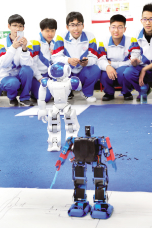 昨日,天津市第四十三中学220余名高一新生来到天津工业大学,到10个学院参观实践,感受各专业特色。这批新生是2020年高考实行“3+3”新政的首批学生,不分文理科,选取考试科目并报考专业关系到未来发展。图为学生与智能机器人互动。