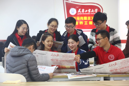 10月21日,天津工业大学“青年马克思主义培养工程”培训班第一期学员开展以“传承红色基因 担当筑梦重任”为主题的学习党的十九大精神实践教育活动。学员们共同研读《人民日报》“欢庆党的十九大特刊”,分享研读体会。