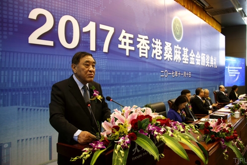 香港桑麻基金会受托人、原中国纺织工业联合会会长王天凯先生宣读了2017年香港桑麻奖获奖名单。本次共评选出桑麻纺织科技奖获得者16人、桑麻奖教金获得者40人、桑麻奖学金获得者338人。其中,天津工业大学获得桑麻奖教金10人、桑麻奖学金60人。主席台就座的领导和嘉宾为获得桑麻纺织科技奖、桑麻奖教金、桑麻奖学金的代表颁奖。