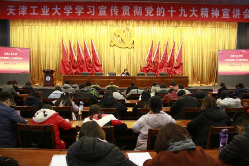 2017年12月7日下午,天津工业大学学习贯彻党的十九大精神宣讲会在学术中心举行。校党委书记连洁做宣讲报告,解读党的十九大精神。各学院党委副书记、学办主任,学工部、团委科级以上干部,学生党员代表等近300人参加。宣讲会由校党委副书记刘亚男主持。