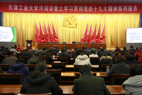 2017年12月12日,天津工业大学“泮湖讲堂”之学习贯彻党的十九大精神系列报告会在学术中心举行。南开大学原副校长、天津市高校思想政治理论宣讲“教授团”成员逄锦聚教授,受邀做了主题为《深刻理解和把握我国社会主要矛盾》的报告,深入解读党的十九大精神。校领导连洁、杨庆新、刘亚男、赵宏出席,党校青年骨干教师培训班全体学员、党外人士代表培训班全体学员,全体中层干部,管理学院、经济学院、马克思主义学院相关专业研究生代表近300人参加。报告会由校党委书记连洁主持。