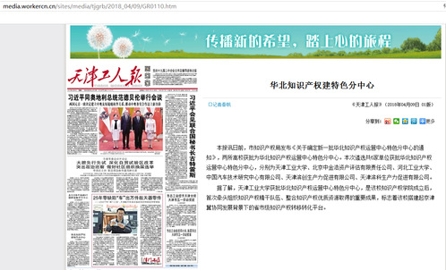 2018年4月9日,《天津工人报》第1版以《华北知识产权建特色分中心》为题对我校做了报道,现将全文转发如下,以飨读者。