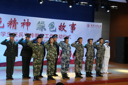 会上,一段征兵宣传片拉开了启动仪式帷幕。李仁军、罗崇斌、尚耀辉三位大学生士兵校友和一名退役在校生杨文娜分别发言,讲述了他们的“红色精神 绿色故事”。李仁军,理学院数学系09级学生,2013年6月入伍,曾服役于解放军海军南海舰队某水兵训练基地、中国人民解放军海军特种作战团(现海军陆战队某特战旅,电影《红海行动》原型部队),退役后考取清华大学数学与科学学院硕士研究生。杨文娜,现为纺织学院纺织工程1604班学生,2012年12入伍,服役5年,2017年12月以一期士官身份退伍,现担任天津工业大学大学生士兵协会会长。尚耀辉,经济学院金融专业10级学生,2011年12月至2013年12月服役于武警内蒙古总队呼伦贝尔市支队根河中队,现就职于河东区发展和改革委员会。罗崇斌,纺织学院非织造材料与工程专业11级学生,2013年9月应征入伍,在西藏拉萨某通信团服役两年,后参加全军统一考试,以全团第一名成绩考入国防科技大学。他们向大家讲述了自己参军的光荣历史,及在部队的熔炉中所磨练出的意志和品格,感恩军营带给他们的华丽蜕变和快速成长。