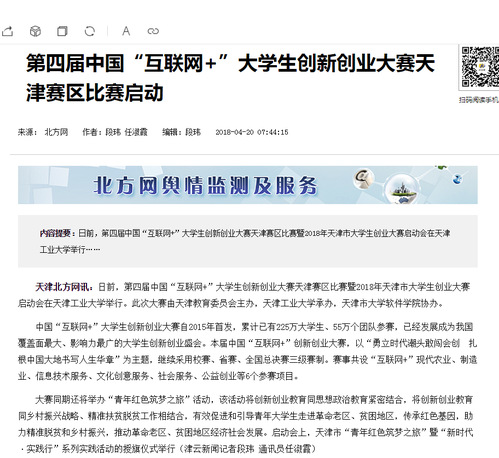 2018年4月20日,北方网以《第四届中国“互联网+”大学生创新创业大赛天津赛区比赛启动》为题对我校进行报道,现将全文转发如下,以飨读者。