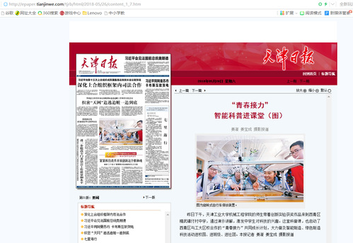 2018年5月26日,《天津日报》第1版以《“青春接力” 智能科普进课堂》为题对我校进行报道,现将全文转发如下,以飨读者。