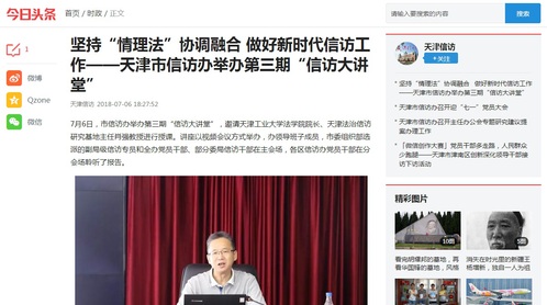 2018年7月6日,今日头条号“天津信访”以《坚持“情理法”协调融合 做好新时代信访工作——天津市信访办举办第三期“信访大讲堂”》为题对我校进行了报道,现将全文转发如下,以飨读者。