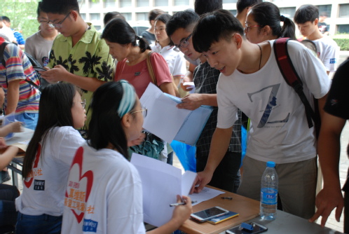 在励志广场的另一边,绿色通道前站着一位位身披绶带的同学,他们是天工大真维斯爱心社的社员,负责新生在绿色通道的引导工作。其中2017级日语专业的冯卓同学,从7点就开始为通道处的新生解答疑问,做好引导。一直到中午11点半,她才在通道后台坐在台阶上匆匆吃过盒饭。