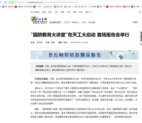 2018年6月29日,北方网以《“国防教育大讲堂”在天工大启动 首场报告会举行》为题对我校做了报道,现将全文转发如下,以飨读者。