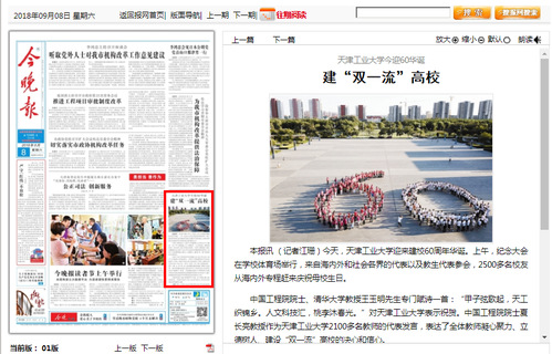 2018年9月8日,《今晚报》第1版以《天津工业大学今迎60华诞 建“双一流”高校》为题对我校进行报道,现将全文转发如下,以飨读者。