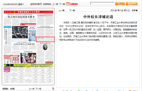 2018年9月8日,《今晚报》第2版以《中外校长津城论道》为题对我校进行报道,现将全文转发如下,以飨读者。