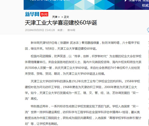 2018年9月9日,新华网以《天津工业大学喜迎建校60华诞》为题对我校做了报道,现将全文转发如下,以飨读者。