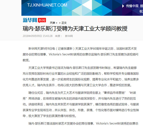 新华网天津9月9日电(记者张建新)天津工业大学60周年华诞之际,法国时装艺术发展协会的常任理事、Victoria's Secret时装秀的创意总监瑞内·瑟乐斯汀先生受聘为该校顾问教授。