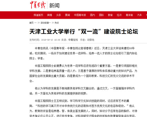 2018年9月10日,中青在线以《天津工业大学举行“双一流”建设院士论坛》为题对我校做了报道,现将全文转发如下,以飨读者。