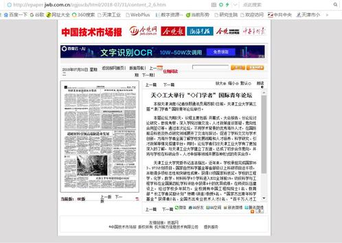 2018年7月31日,《中国技术市场报》第02版以《天津工大举行“津门学者”国际青年论坛》为题对我校做了报道,现将全文转发如下,以飨读者。