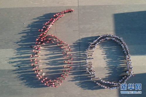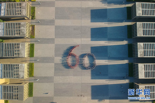 9月7日下午,来自天津工业大学的老校友们相聚在校园内的励志广场,摆成“60”字样。(无人机拍摄) 新华社发(沈岳 摄)