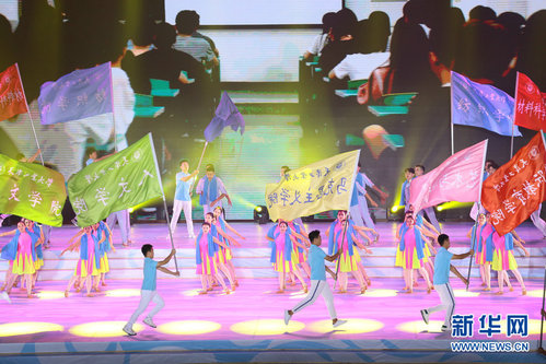 9月7日晚上,天津工业大学的老校友、教职工、大学生欢聚在校内的体育馆表演节目。新华网发(沈岳 摄)