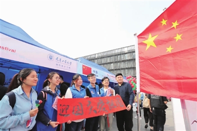 天津工业大学的学生们用书法的形式迎接即将到来的国庆节。 沈岳摄