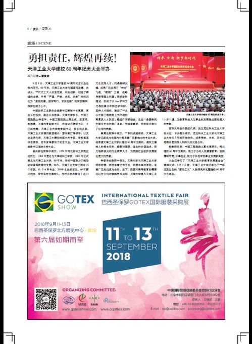 2018年9月8日,《纺织服装周刊》以《勇担责任,辉煌再续!天津工业大学建校60周年纪念大会举办》为题对我校做了报道,现将全文转发如下,以飨读者。
