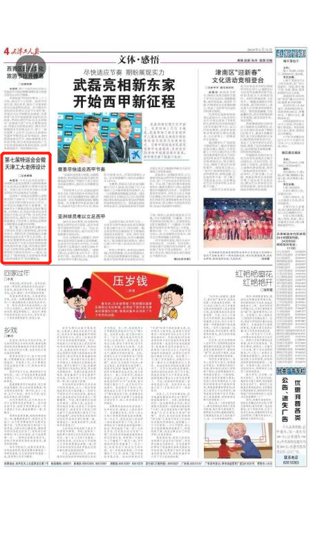 2019年01月31日,《天津工人报》第4版以《第七届特运会会徽天津工大老师设计》为题对我校做了报道,现将全文转发如下,以飨读者。