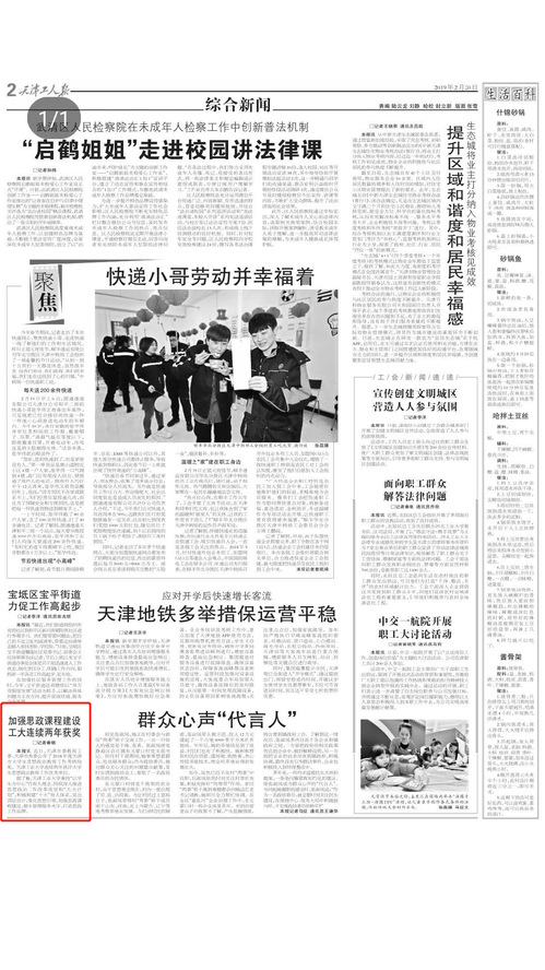 2019年2月20日,《天津工人报》以《加强思政课程建设工大连续两年获奖》为题对我校做了报道,现将全文转发如下,以飨读者。