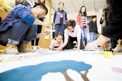 连日来,天津工业大学组织全校同学开展2019年学雷锋主题实践活动。图为经管学院的师生来到西青区王稳庄镇康泰园社区,与农民工子女绘出心中梦想。(张立摄)