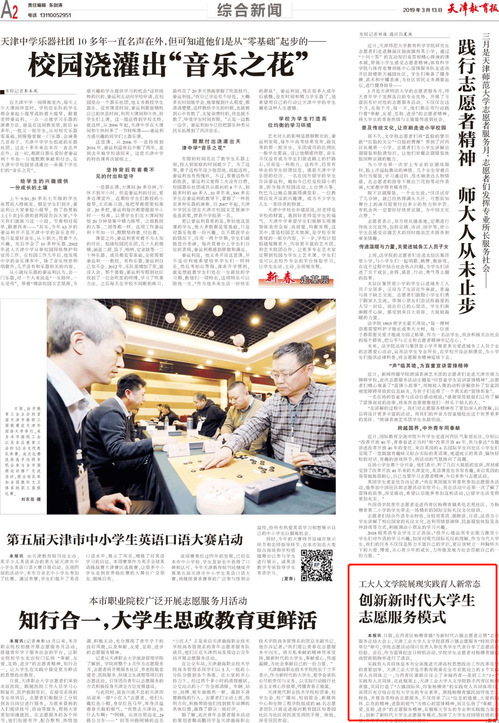 2019年03月13日,《天津教育报》第二版以《创新新时代大学生志愿服务模式》为题对我校做了报道,现将全文转发如下,以飨读者。