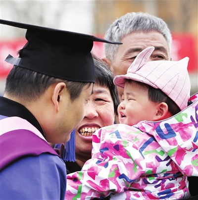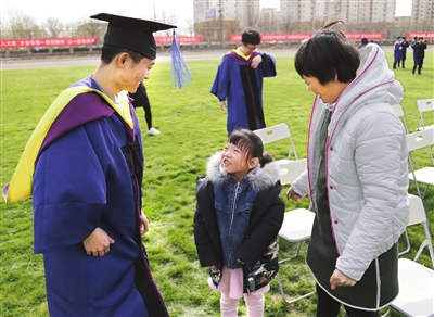 一名山东毕业生的母亲带着7岁小女儿参加大儿子的毕业礼。