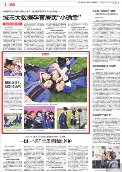 2019年04月01日,《天津日报》第三版以《草地毕业礼特别接地气》为题对我校做了报道,现将全文转发如下,以飨读者。