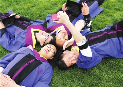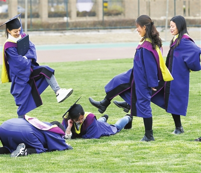 典礼结束后,毕业生们在草地上摆出各种造型,拍下“最后的校园合影”。