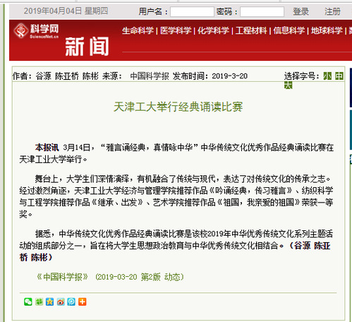 2019年03月20日,《中国科学报》第二版以《天津工大举行经典诵读比赛》为题对我校做了报道,现将全文转发如下,以飨读者。