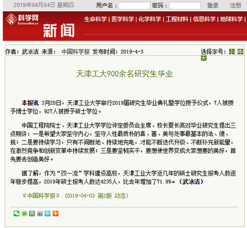 2019年04月03日,《中国科学报》第二版以《天津工大900余名研究生毕业》为题对我校做了报道,现将全文转发如下,以飨读者。