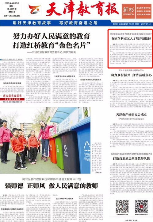 2019年04月15日,《天津教育报》第一版以《京津冀工业大学电子信息类专业新工科建设研讨会举行探索学科交叉人才培养新途径》为题对我校做了报道,现将全文转发如下,以飨读者。
