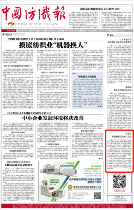 2019年4月10日,《中国纺织报》第一版以《天工大开展爱国主题团日活动》为题对我校做了报道,现将全文转发如下,以飨读者。