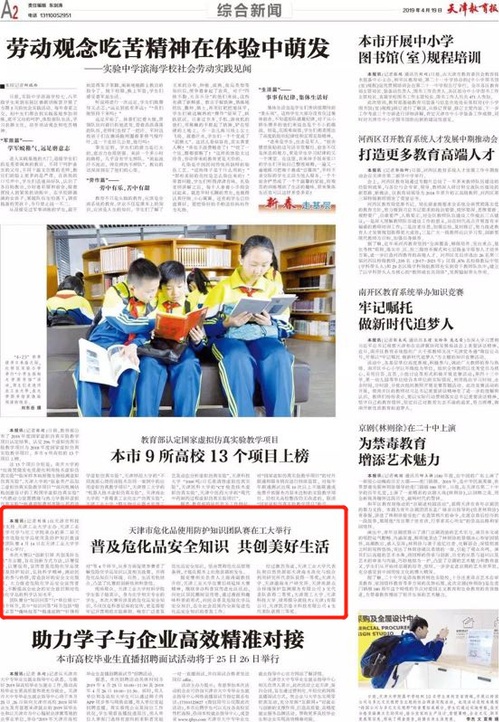 2019年04月19日,《天津教育报》以《天津市危化品使用防护知识团队赛在工大举行普及危化品安全知识共创美好生活》为题对我校做了报道现将全文转发如下,以飨读者。