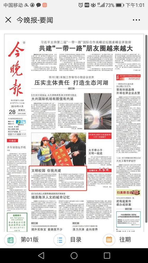 2019年4月28日,《今晚报》第一版以《文明校园 你我共建》为题对我校做了报道,现将全文转发如下,以飨读者。