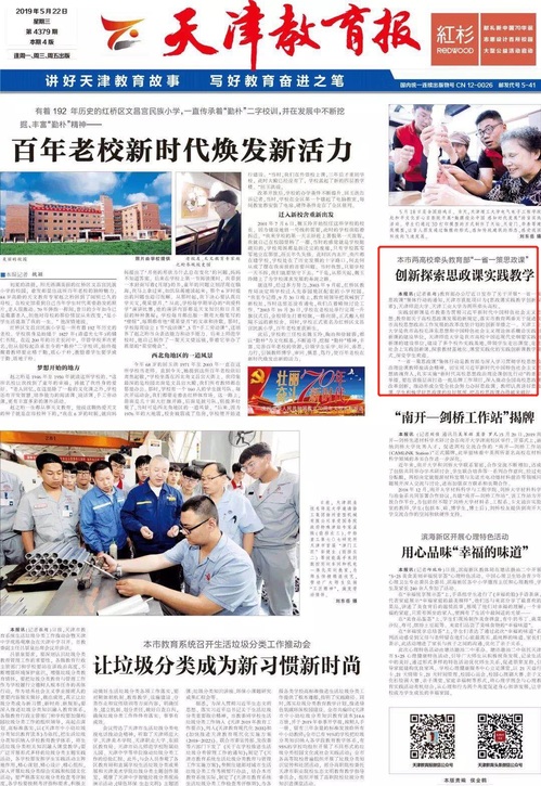 2019年5月22日,《天津教育报》第一版以《本市两高校牵头教育部“一省一策思政课” 创新探索思政课实践教学》为题对我校做了报道