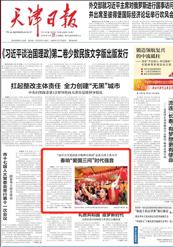 2019年5月31日,《天津日报》以《“南开大学爱国奋斗精神宣讲团”走进天津工业大学奏响“爱国三问”时代强音》为题对我校做了报道,现将全文转发如下,以飨读者。
