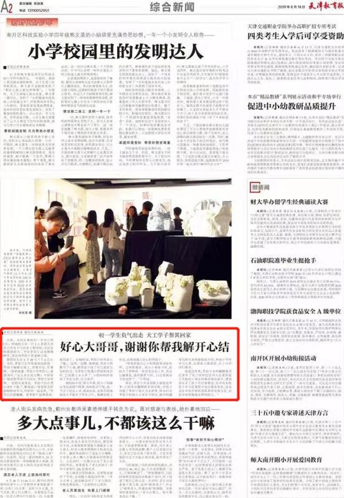 2019年6月14日,《天津教育报》第二版以《初一学生负气出走天工学子帮其回家 好心大哥哥,谢谢你帮我解开心结》为题对我校做了报道,现将全文转发如下,以飨读者。